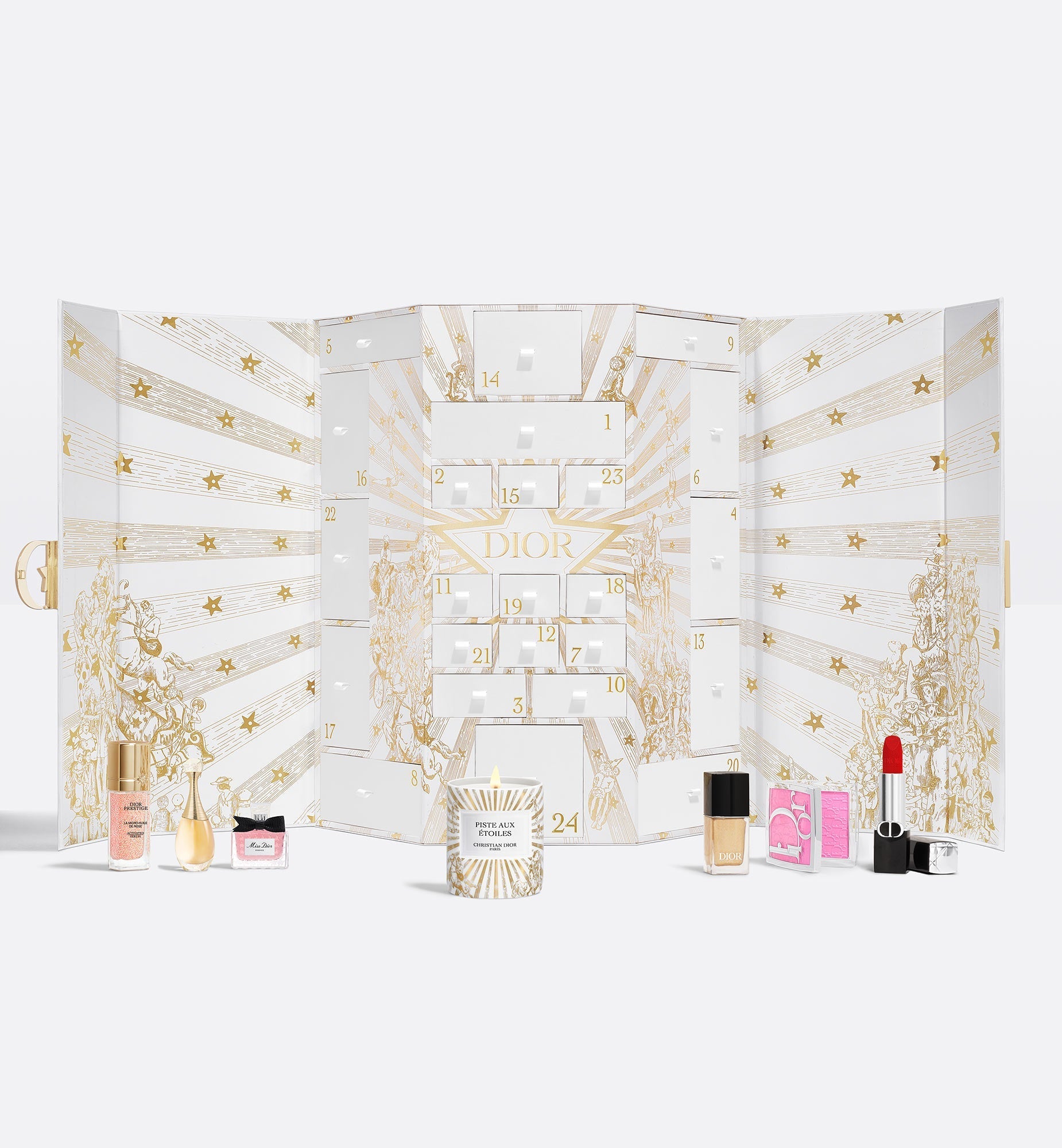 Paris'in şiirsel bir resmi olan bu Dior Yaklaşan Noel Takvimi, nezih parfümler, sofistike makyaj ve cilt bakım ürünleri ve kokulu bir mum da dâhil olmak üzere House of Dior'dan 24 minyatür kreasyona ev sahipliği yapıyor. Noel için gün sayarken bir yandan da House of Dior'un ikonik tasarımlarını yeni baştan keşfetmenize yardımcı olacak sürprizlerle dolu bir set.